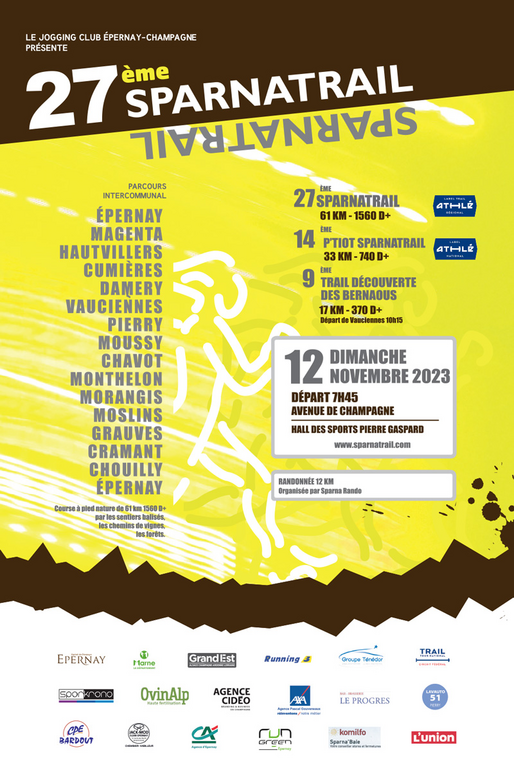 - Le 12 novembre s'effectuera le retour de notre trail fétiche macadam ! le sparnatrail (51) qui ne cesse d'évoluer avec cette année une intégration des cotations ITRA et index UTMB, tout en restant labellisé FFA national. Le parcours a été remanié dernièrement, mais nous restons toujours entre vignobles et forêts sur un parcours vallonné, avec ce superbe départ avenue de Champagne et toutes les infrastructures qui vont avec comme la consigne gardée, douche, possibilité de restaurer au chaud et sec dans le hall où est jugé l'arrivée. Plusieurs distances ouvertes aux coureurs: - le trail des bernaous. Départ de Vauciennes pour cette épreuve en ligne de 17 km et 350 m D+. Il faudra prendre le bus de l'organisation pour se rendre au départ. Avant votre départ on peut y encourager les participants du p'tiot et sparnatrail qui passent juste là ! Distance prise en charge par le club avant dépassement - Le p'tiot sparnatrail. 32 km pour 740 m D+.Label national. Distance au TTN. Épreuve en boucle avec départ commun sparnatrail à 7h45 officiel. Un dépassement de 13 € est actuellement à la charge du traileur - Sparnatrail: Boucle de 61 km et 1 560 m D+ Label régional avec pour les finishers la bouteille de Champagne aux couleurs de l'épreuve. Un dépassement de 30 € restera à charge du coureur.